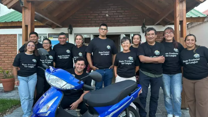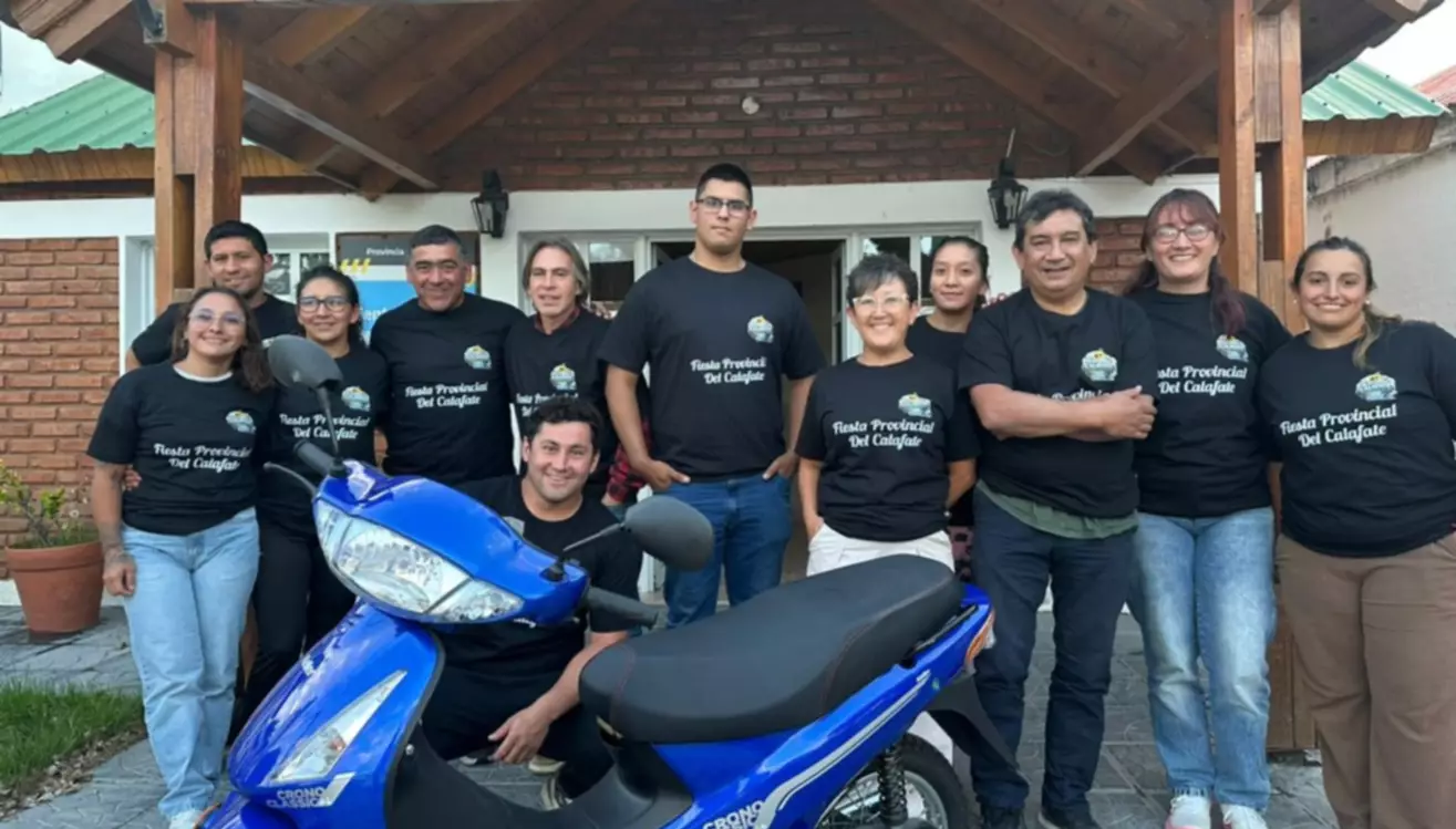 Este grupo de jóvenes que forman parte de la comisión organizadora de la 36ta Fiesta Provincial del Calafate, que se realizará en Tecka este fin de semana, presentaron la moto cero kilómetros que se sorteará en el transcurso de la festividad.