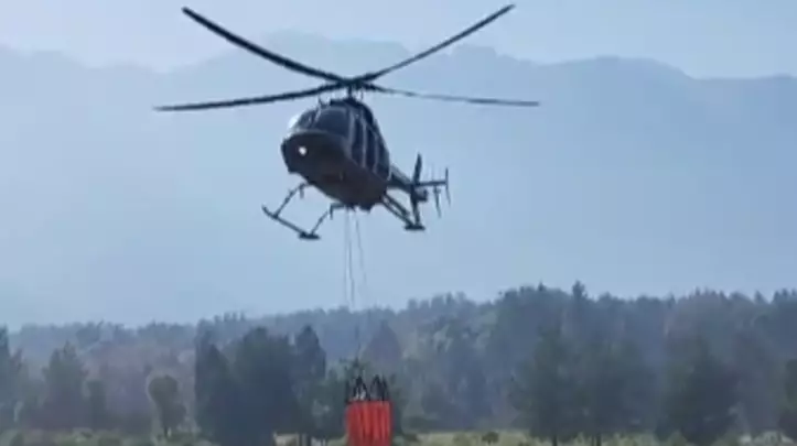 Un helicóptero lleva a cabo el traslado aéreo de brigadistas desde Puerto Patriada hacia la zona de Laguna Los Cinco Saltos, donde continúan las tareas de combate en sectores con focos activos.