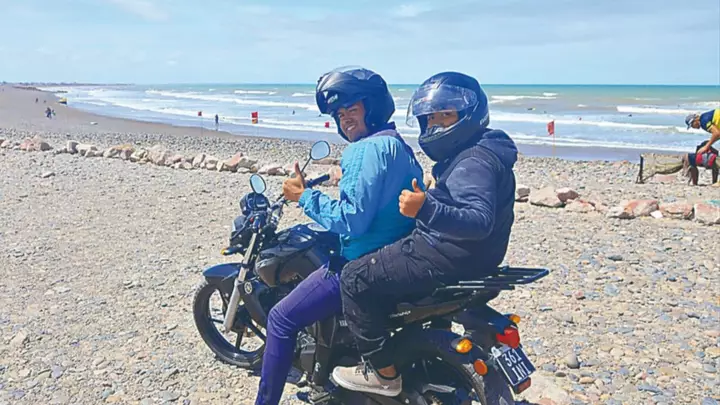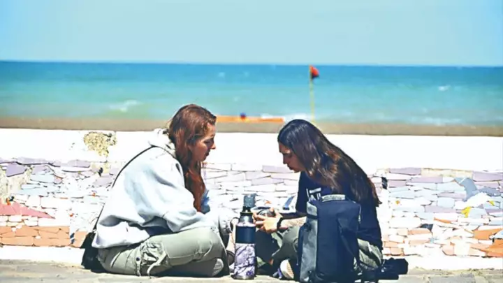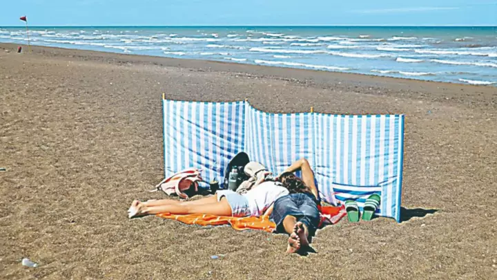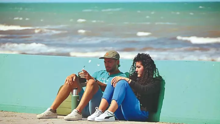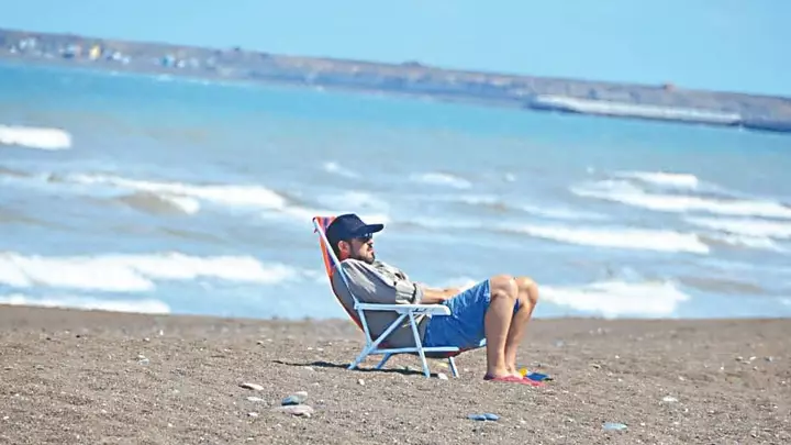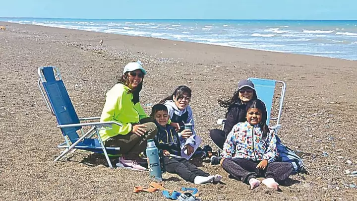 Más alejados de la orilla, familias completas se instalaron con reposeras y termos, buscando reparo del viento y disfrutando del aire libre. Adultos y niños compartieron mates, abrigo liviano y momentos de descanso, en una playa extensa y tranquila, con poca gente dispersa a lo largo de la costa. El mar, de tonos verdosos y movido, acompañó la escena con su sonido permanente.