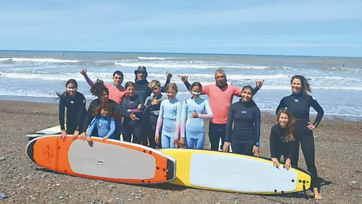 Desde temprano, la playa mostró movimiento. Un grupo numeroso de surfistas, grandes y chicos, se reunió sobre la arena con tablas apoyadas frente al mar, dando marco a una postal típica del balneario. Con trajes de neoprene y sonrisas visibles pese al clima fresco, compartieron la jornada entre charlas, risas y preparación para ingresar al agua, mientras las olas rompían de manera constante.