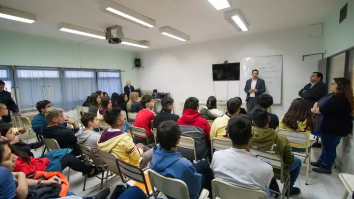 El Intendente de Trelew, Adrián Maderna, visitó hoy a estudiantes de los últimos años de la Escuela N°724 “Presidente De La Nación Dr. Arturo Illia” y comprometió la ayuda del Municipio para la realización del acto de fin de curso y el viaje de estudios.