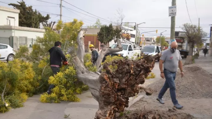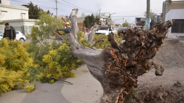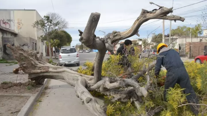 Personal de Gestión Urbana, dependiente de la Municipalidad de Trelew, trabajó esta tarde en calle 25 de Mayo y Corrientes, por la caída de un árbol de gran porte como consecuencia de los fuertes vientos que ya empezaron a sentirse y tendrán pico de intensidad mañana al mediodía.