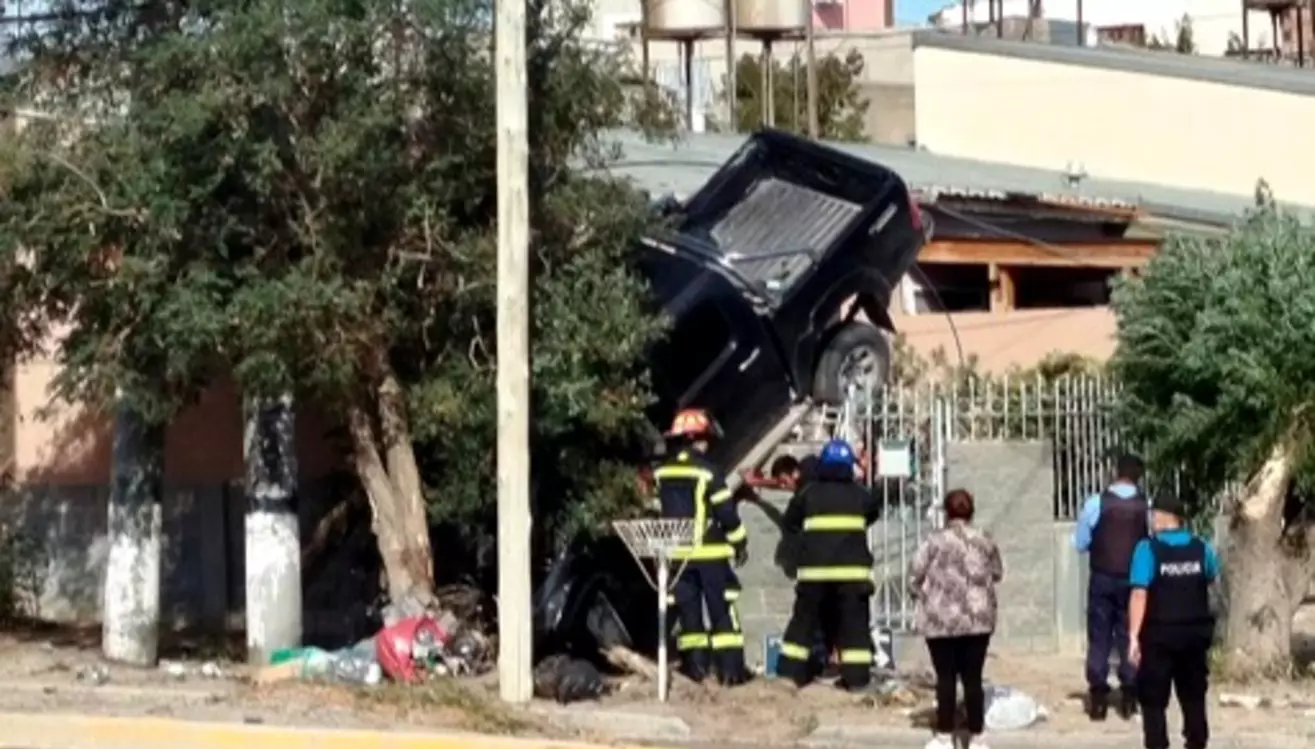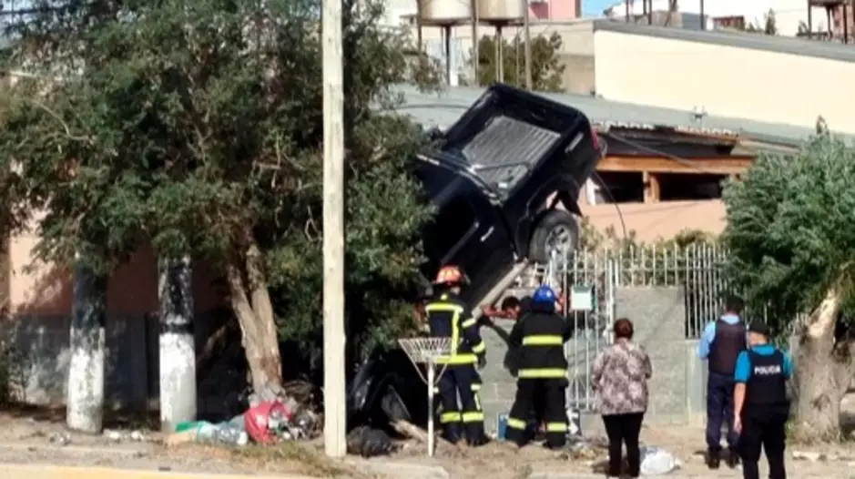 Un hecho insólito sucedió esta tarde en la ciudad de Comodoro Rivadavia, cuando una camioneta Toyota Hilux, quedó colgada de un portón de una vivienda en la Avenida Lisandro de la Torre, tras protagonizar un accidente el cual hasta el momento se esta investigando los hechos.